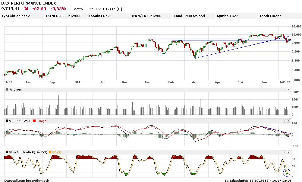 Noch kann sich der DAX im Bereich der Unterstützungszone halten. Zum Schluss der vergangenen Woche wurde diese aber kurzzeitig bereits unterschritten. Die Rückeroberung dieser Zone ist sicher auch dem Kaufsignal beim Stochastik-Indikator zu verdanken. Ob dieses ausreicht, um den alten Aufwärtstrend wieder aufzunehmen, ist mehr als fraglich. Der MACD-Indikator zieht unverändert nach unten und zeigt noch keine Bereitschaft für einen Dreh nach oben. Daher dürfte der neue kurzfristige Abwärtstrend weiter intakt bleiben, auch wenn zwischenzeitliche Korrekturbewegungen nach oben möglich sind.