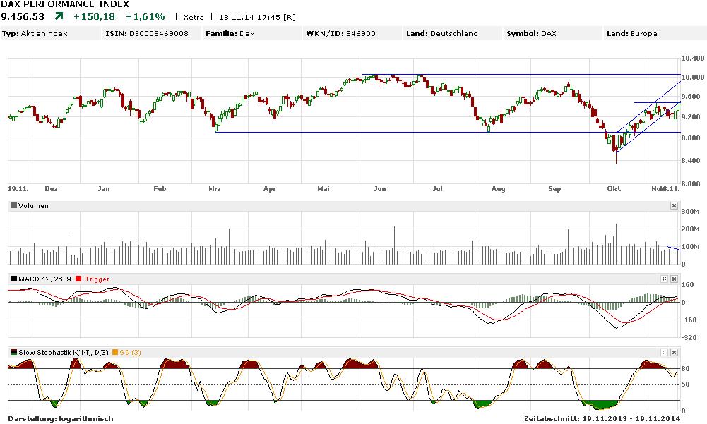 Nach dem Bruch des Aufwärtstrendkanals konnte der DAX wieder an die untere Begrenzung dieses Kanals heranlaufen. Hier liegt auch das jüngste Top. Dieser Widerstand bildet mit der Trendkanalbegrenzung nun einen Kreuzwiderstand. Die Umsätze sind in den letzten Tagen kontinuierlich gefallen. Auch wenn sich die Indikatorenlage wieder etwas verbessert hat, fällt es schwer anzunehmen, dass ein Ausbruch nach oben gelingt. Ein Anstieg über den Bereich von ca. 9.470 Punkten würde gleich-wohl Aufwärtspotenzial bis in den Bereich des Tops vom September eröffnen. Auch wenn dieser natürlich nicht ausgeschlossen ist und damit eine Verbeserung der technischen Lage verbunden wäre, ist derzeit die Wahrscheinlichkeit eines erneuten Rück-schlags höher einzuordnen.